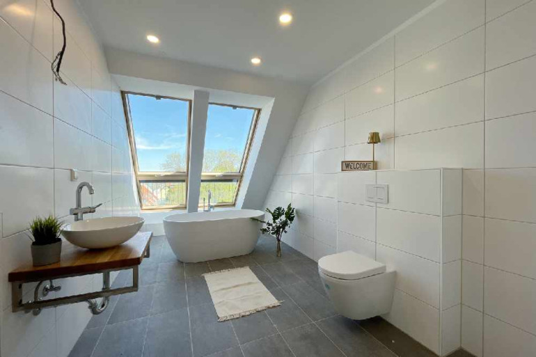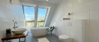 Eine stilvolle Vollholz Eichentreppe verbindet beide Ebenen miteinander und führt in das architektonisch markant gestaltete Obergeschoss. Dort entfaltet die Wohnung ihre volle Großzügigkeit. Eine lichtdurchflutete Galerie bietet individuelle Nutzungsmöglichkeiten wie einen Fitnessraum oder einen Wirtschaftsraum etc. Das Highlight dieser Ebene ist zweifellos das großzügige Bad: Ausgestattet mit freistehender Badewanne, bodengleicher Dusche, WC und Handwaschbecken – dazu ein atemberaubender Blick ins Grüne, der für ein außergewöhnliches Wohngefühl sorgt. Ergänzt wird das Raumangebot durch einen separaten Technikraum.