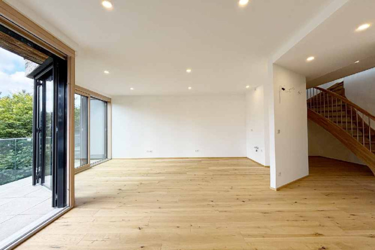 Bereits im unteren Geschoss erwartet Sie eine helle, einladende Wohnküche mit direktem Ausgang ins Freie. Die angeschlossene Terrasse bzw. Loggia, mit auf Drainagekies verlegte Feinsteinzeug Platten, erweitert den Wohnbereich und schafft eine fließende Verbindung von Innen und Außen. Zudem stehen Ihnen zwei Zimmer, ein modernes Badezimmer mit Dusche, WC und Aufsatzschalen auf einen Vollholz Waschtisch sowie ein Abstellraum zur Verfügung - ideal für das tägliche Familienleben.