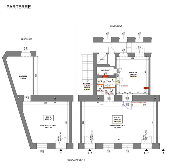 Die Einheit Top 05–07 ist prädestiniert für individuelle und kreative Konzepte. Die zwei separaten Eingänge bieten optimale Möglichkeiten zur Nutzung durch zwei Parteien oder zur Trennung von Kunden- und Arbeitsbereich. Die großzügige Raumhöhe schafft ein außergewöhnliches Raumgefühl und unterstreicht die offene Loft-Atmosphäre.