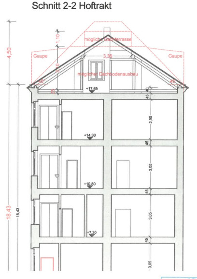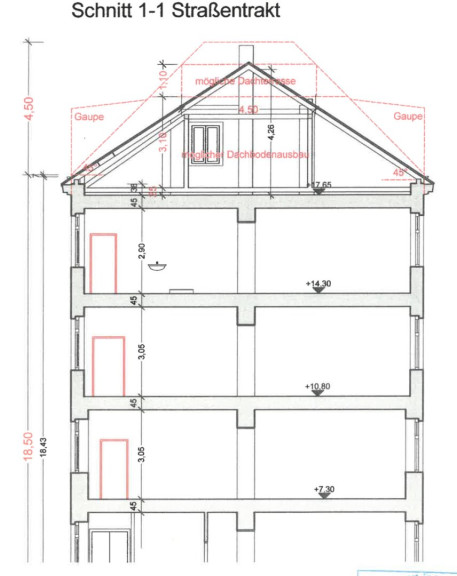- maximale Gebäudehöhe 18,50 m, daher keine nennenswerte Erhöhung möglich; Ausbau unter 45° mit oberstem Abschluss 4,50 m über maximalen Gebäudehöhe (sehe Schnitt 1:1);