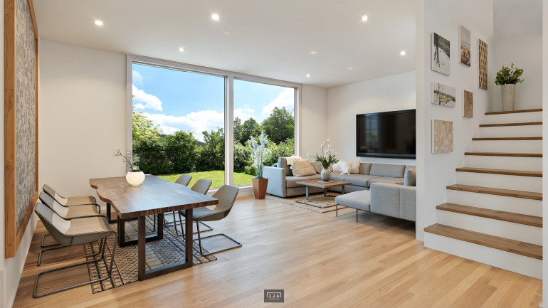 Über den Garderobenbereich mit angrenzendem Abstellraum gelangen Sie in die abgetrennte Küche im Erdgeschoss – danach in den großzügigen Wohn-/ Essbereich, welcher aufgrund zahlreicher Verglasungselemente sehr hell und freundlich wirkt. Von hier aus erreichen Sie den vorgelagerten Terrassen- sowie Privatgartenanteil (Vorgarten ca. 15,66 m² + Garten süd- + südwestseitig ca. 103,06 m²).