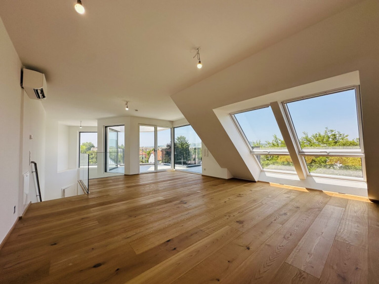 Es gibt Orte, an denen man nicht einfach wohnt, sondern ankommt. Diese 5-Zimmer-Rarität gehört dazu. Schon beim Eintreten öffnet sich der Blick weit hinaus – bis zum Kahlenberg, wo der Himmel die Hügel berührt und jeder Tag ein anderes Licht zeichnet. Selbst an trüben Tagen bleibt die Wohnung erfüllt von Helligkeit, als hätte sie ihre eigene Sonne.