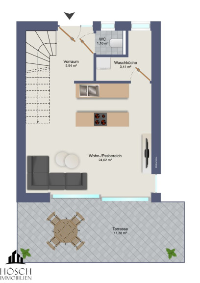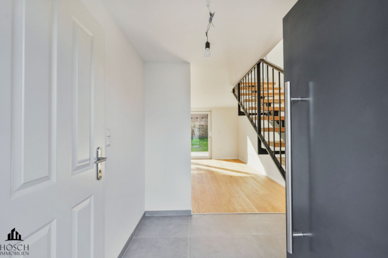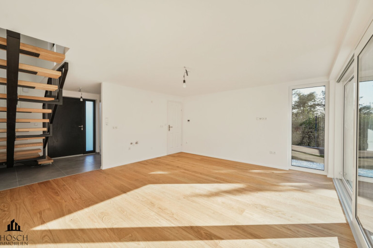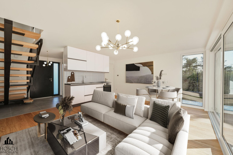 Im Erdgeschoss befinden sich der Eingangsbereich, ein Gäste-WC sowie ein großzügiger Wohn- und Essbereich mit offener Küche.
