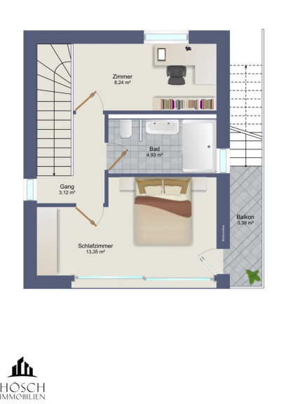 Im Obergeschoss erwartet Sie das Badezimmer mit Dusche und WC, sowie zwei weitere schöne und helle Zimmer (ca. 13,35 und 8,24 m²).