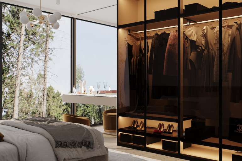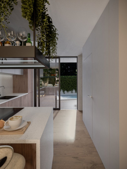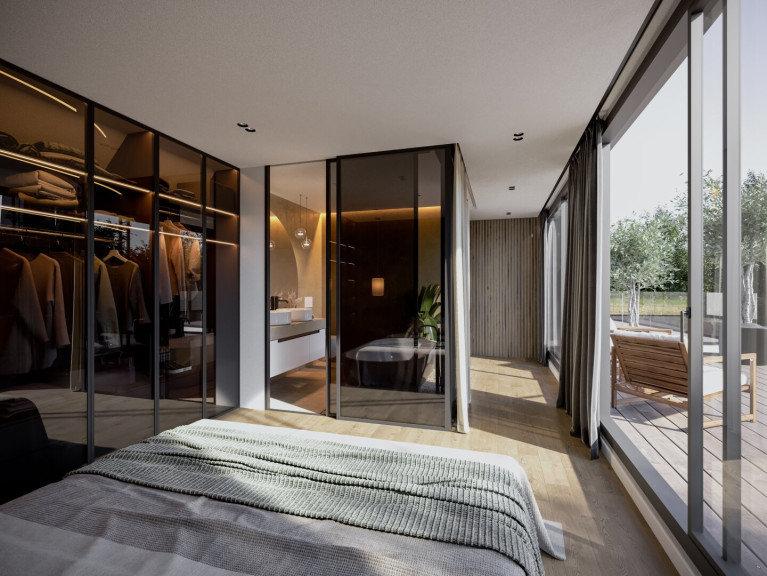 Die Wohnräume präsentieren sich lichtdurchflutet und großzügig – dank großflächiger, intelligent platzierter Fensterfronten, die nicht nur maximales Tageslicht ermöglichen, sondern zugleich ein hohes Maß an Privatsphäre bewahren.