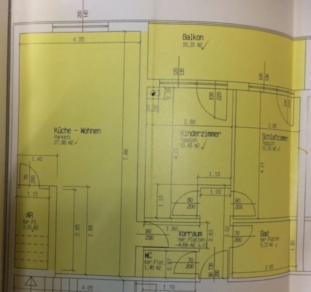 Die drei Zimmerwohnung liegt im 1 Stock ohne Lift, und gliedert sich auf in eine Wohnküche sowie zwei Schlafzimmer mit Balkon, Vorraum, Bad mit Wanne und separate Toilette. Die Wohnung ist ausgestattet mit Laminatboden.