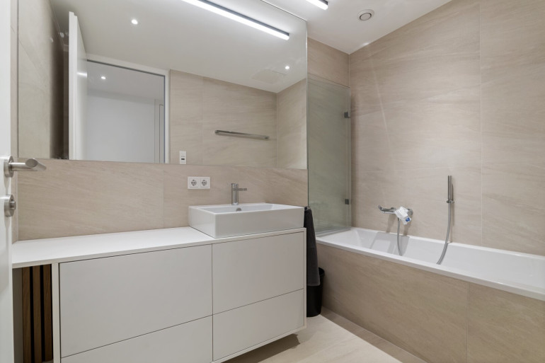 Innen bietet die Wohnung eine voll ausgestattete Einbauküche, in der Sie Ihre kulinarischen Fähigkeiten entfalten können. Die modernen Badezimmer sind jeweils mit einer Badewanne bzw. einer Dusche ausgestattet. Zudem gibt es ein Gäste-WC.