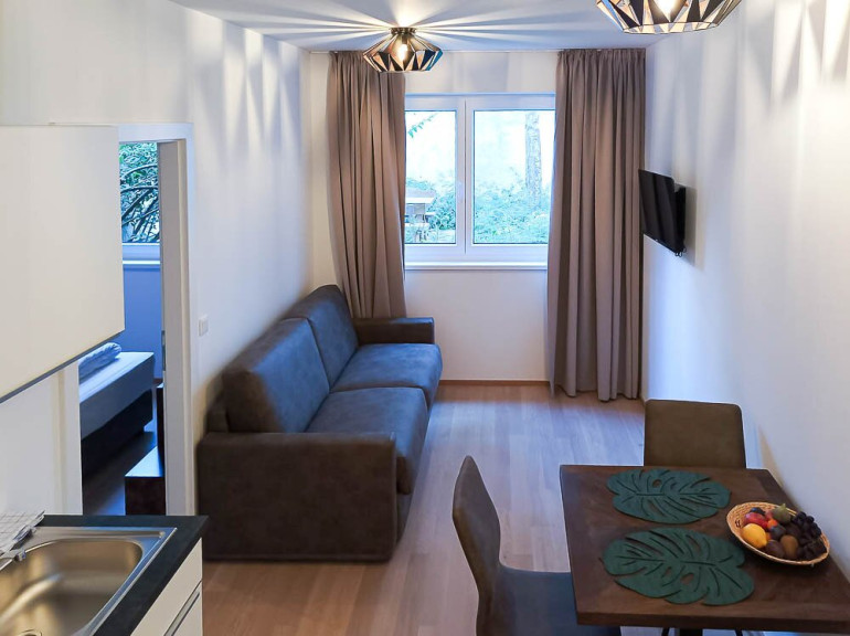 Die Einheit wurde in vier getrennt begehbare, modern ausgestattete Apartments unterteilt, zusätzlich stehen ein Rezeptionsbereich, eine Waschküche sowie ein Abstellraum für Kinderwägen zur Verfügung.