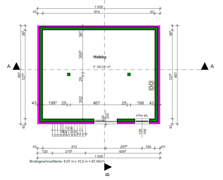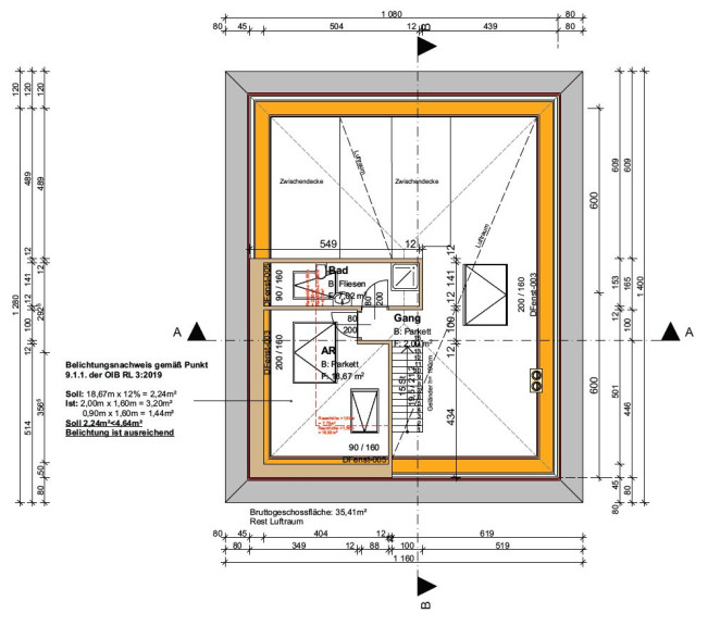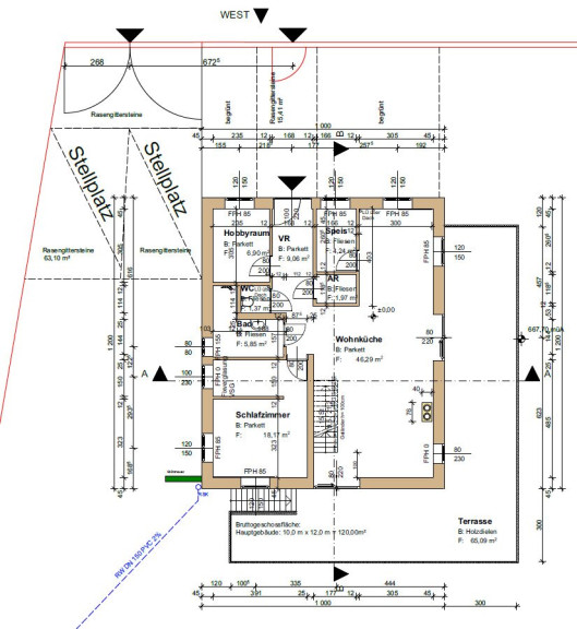 Das Wohnhaus verfügt laut Einreichplan über eine geplante Wohnnutzfläche von ca. 122 m², verteilt auf Erdgeschoß und Dachgeschoß, sowie einen Keller mit zusätzlich ca. 66 m². Der massive Keller ist bereits mit Elektro- und Sanitärinstallationen ausgestattet und bietet somit eine solide Basis für den weiteren Ausbau. Das Gebäude wird von einem klassischen Walmdach abgeschlossen, was die Optik zusätzlich unterstreicht und zugleich funktionale Vorteile bietet.