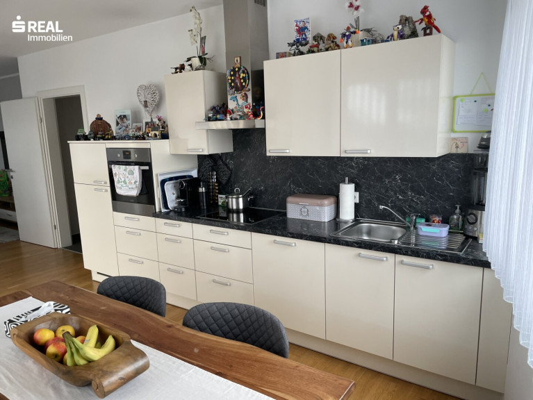 Die Innenausstattung dieser Wohnung ist modern und durchdacht. Hochwertiges Parkett verleiht den Räumen eine warme und einladende Atmosphäre. Die Fußbodenheizung sorgt für wohlige Wärme, egal zu welcher Jahreszeit. Die voll ausgestattete Einbauküche ist nicht nur funktional, sondern auch ein echter Blickfang und bietet Ihnen ausreichend Platz, um kreative Kochabende mit Familie und Freunden zu verbringen.