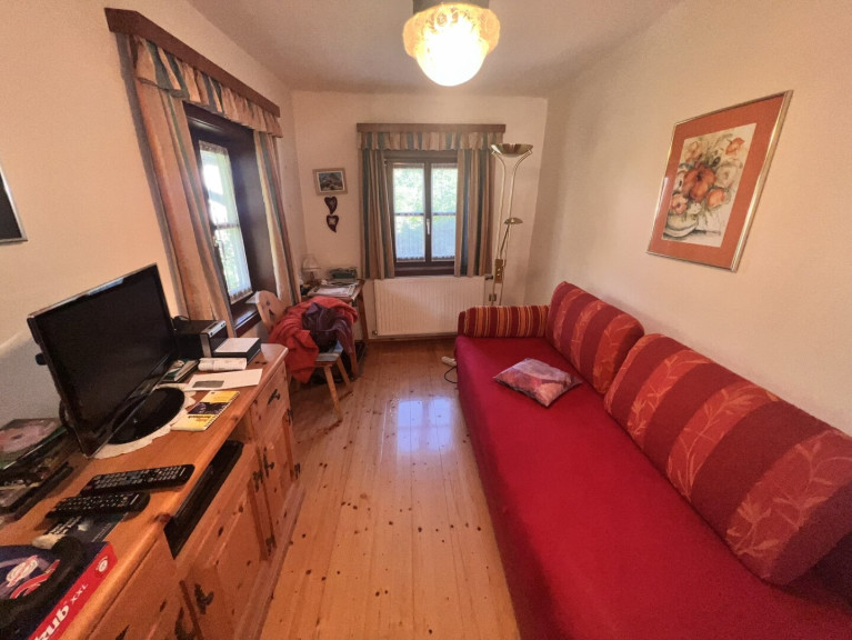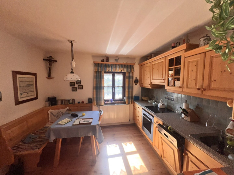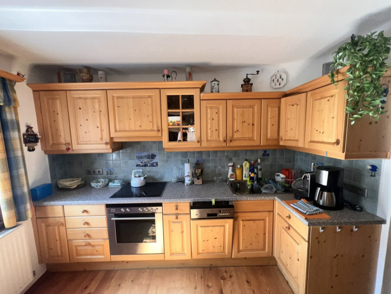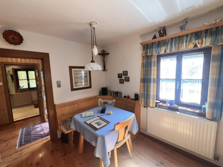Das Obergeschoß besteht aus einem rund 100 Jahre alten Holzriegelbau und verleiht dem Haus seinen einzigartigen, charmanten Charakter. Die Küche ist funktionell und urig eingerichtet. Dort kann nach Herzenslust gekocht und im Essbereich gespeist werden. Ein Zimmer ist mit Zirbenmöbeln urig ausgestattet und verleiht dem Haus Gemütlichkeit.