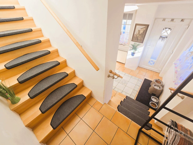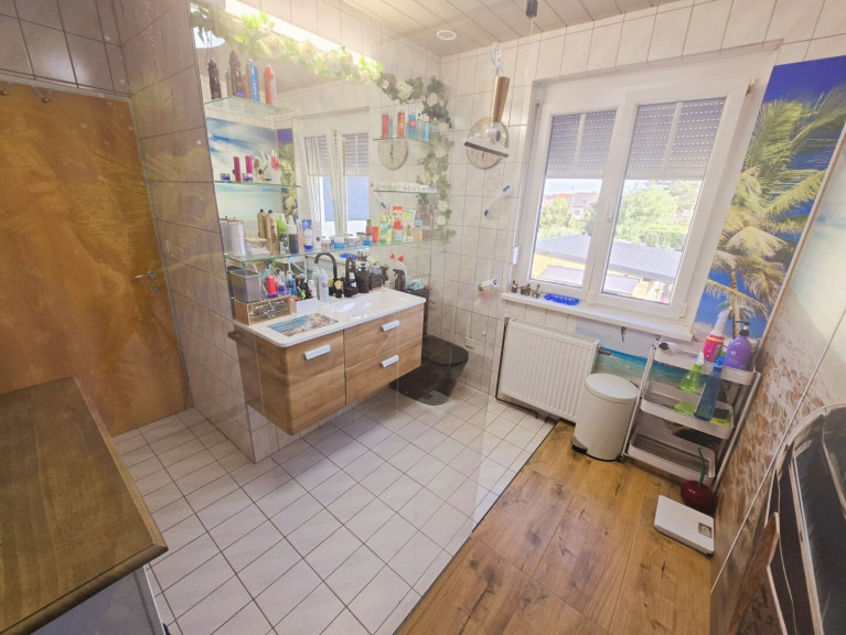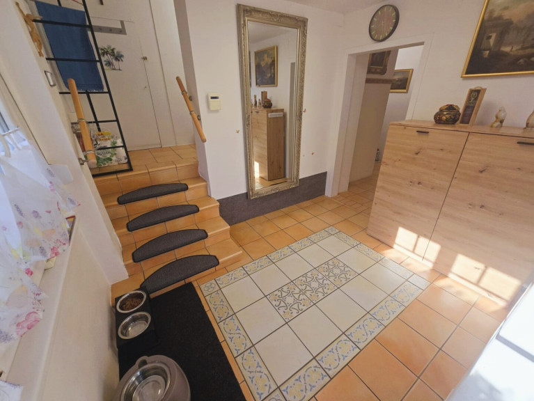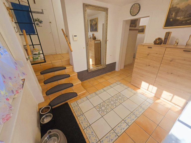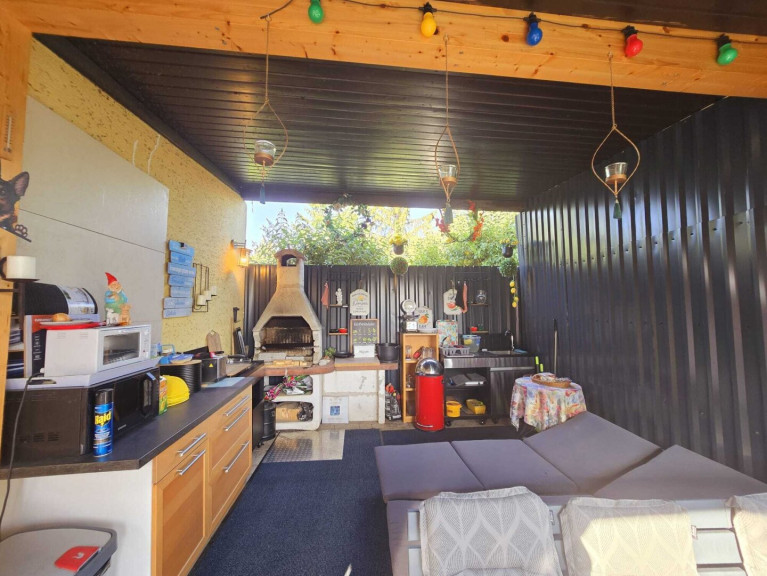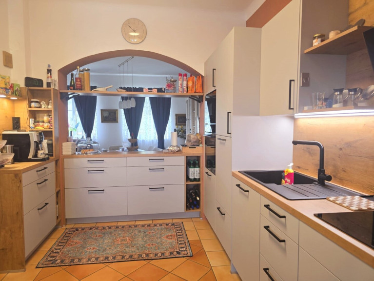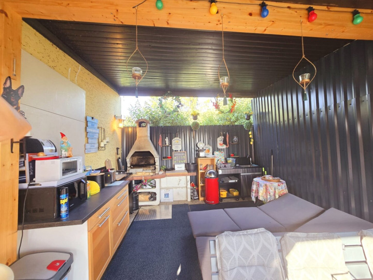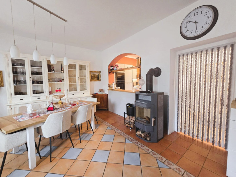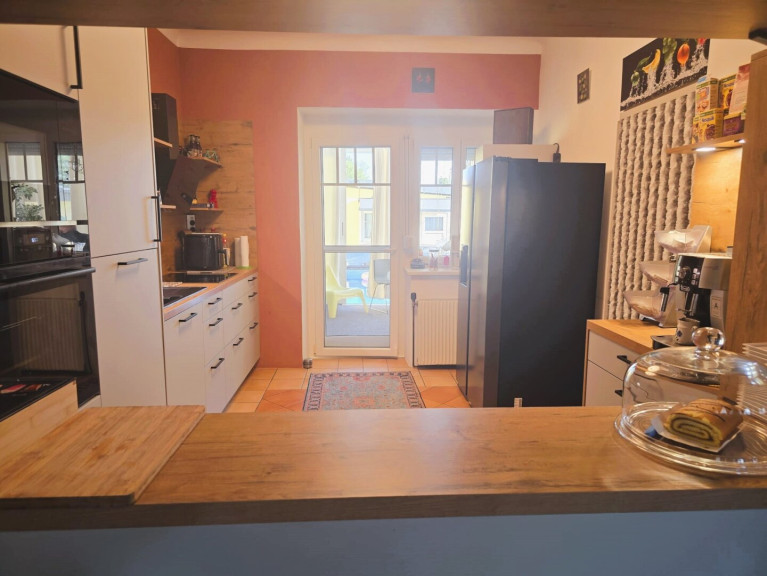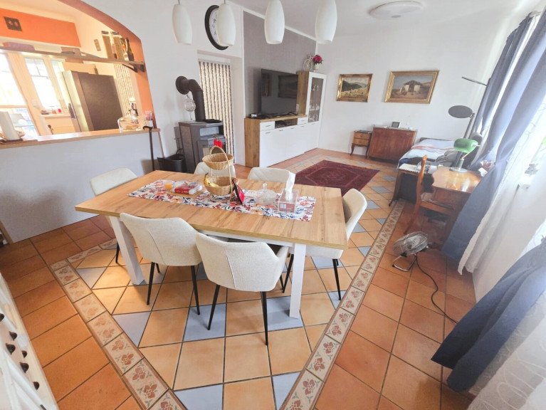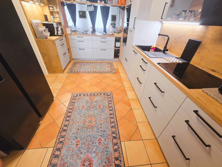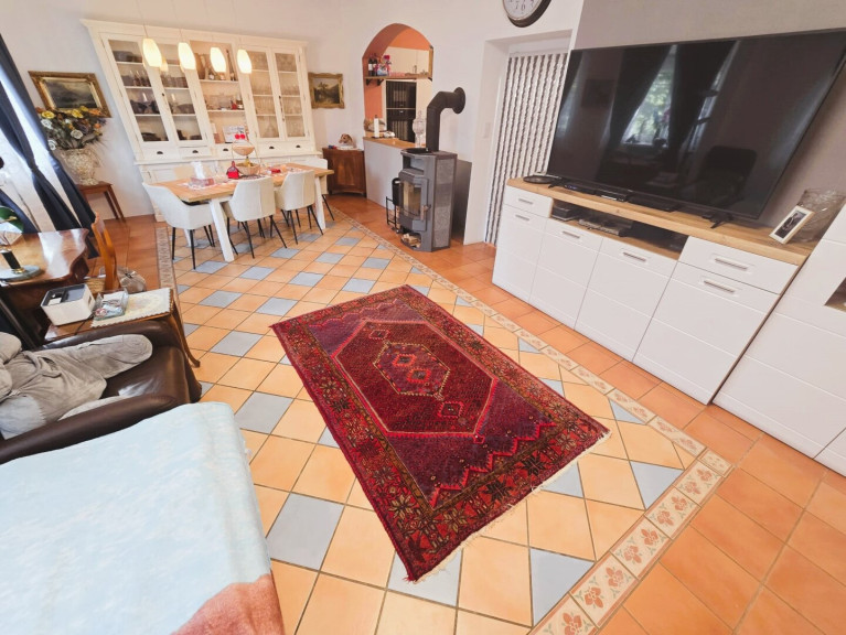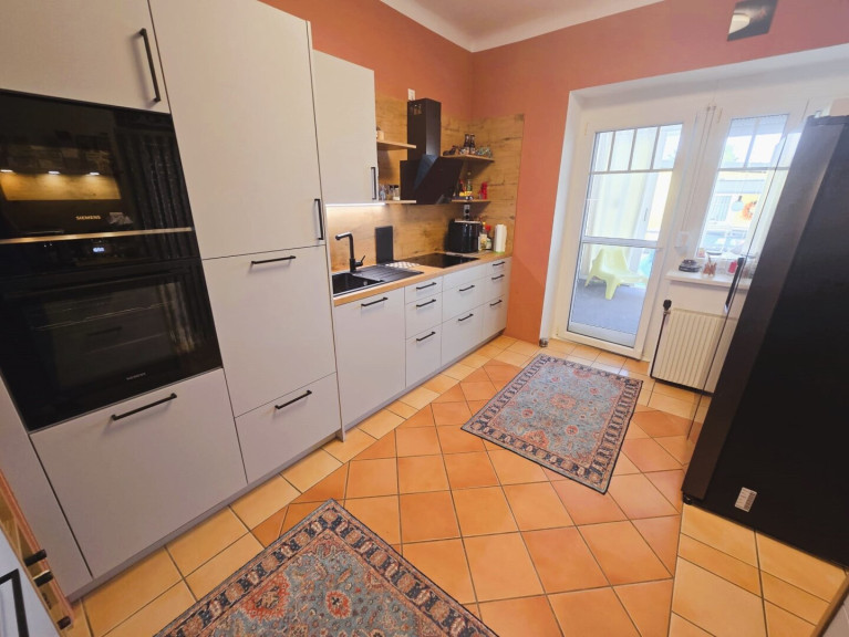 Die offene Wohnküche ist das Herzstück des Hauses. Sie ist mit einer modernen Einbauküche ausgestattet und bietet genügend Platz für gesellige Abende mit Freunden und Familie. Fliesen und Parkettböden sorgen für eine ansprechende und pflegeleichte Gestaltung, während die Zentralheizung für wohlige Wärme sorgt, egal zu welcher Jahreszeit.