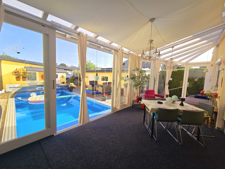 +EINFAMILIENHAUS MIT LUFTWÄRMEPUMPENHEIZUNG + WINTERGARTEN + BEHEIZTER POOL MIT ÜBERDACHUNG + PARTYRAUM + SAUNA + GARAGE + CARPORT + GRILL + NÄHE S-BAHN +