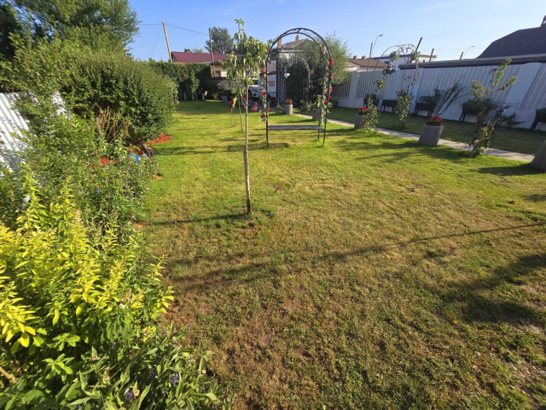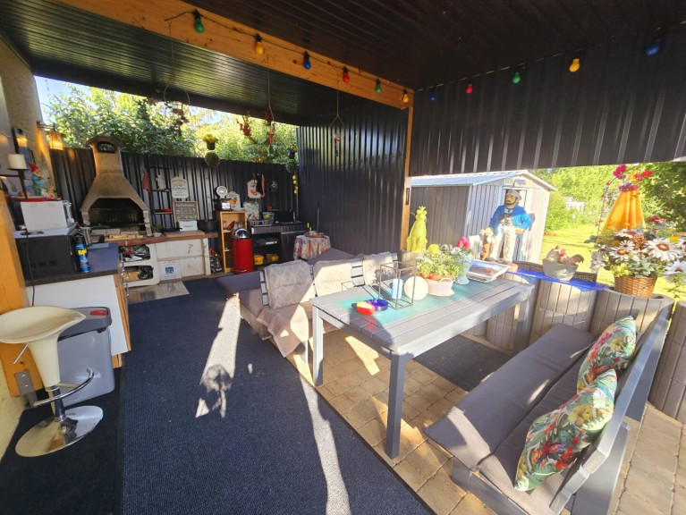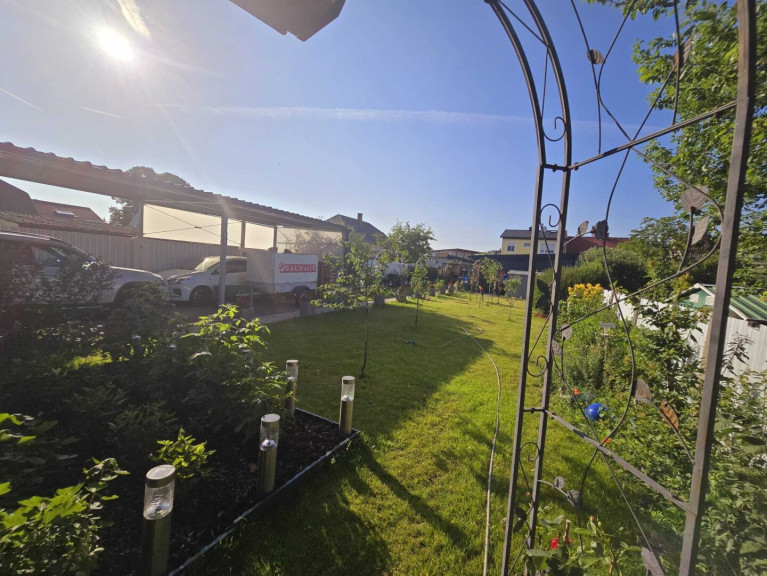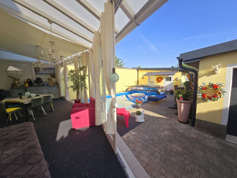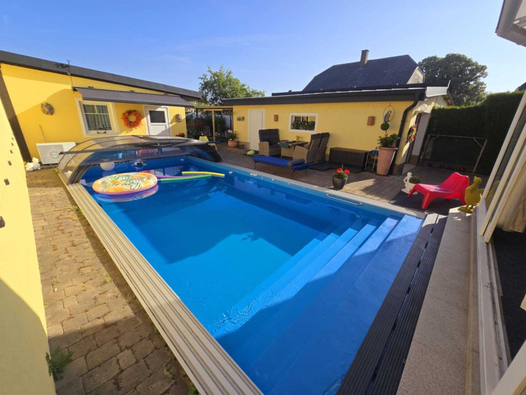 Dieses neuwertige Einfamilienhaus, befindet sich in einem großflächigen Gartenparadies, ausgestattet mit zwei Straßenzufahrten (Haupt- und Nebenstraße), Wintergarten, beheiztem und überdachtem Swimming Pool, Party/Sauna Nebengebäude sowie einer überdachten Grillstelle mit Essplatz. Auf der anderen Seite des Hauses befinden sich zwei Garagenplätze sowie zwei Carportplätze.