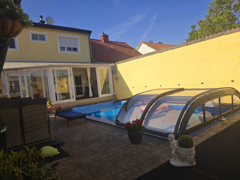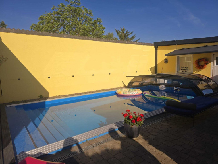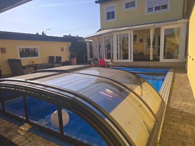 2025 - Überdachung des Swimming Pools, Luftwärmepumpe, Garten mit Aluminiumzaun pulverbeschichtet eingezäunt, Carport-Zugang Aluminiumtor mit Fernbedienung (Schlüssel oder Schalter, innenseitig)