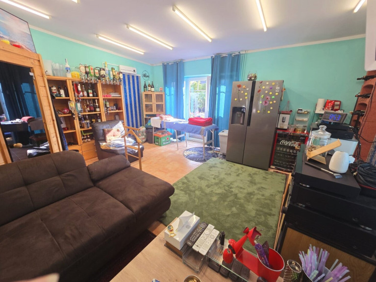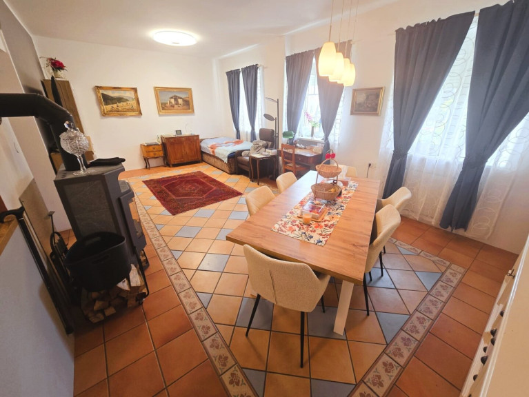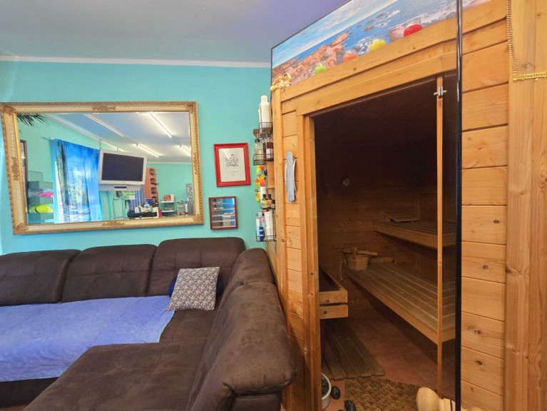 + Wohnessküche 40,36 m², verfliest, mit Kachelofen, neuer DAN-Küche (vom April 2025 im Wert von € 35.000,-) ausgestattet, Zugang zur wunderschönen und hellen überdachten Terrasse/Wintergarten, zum beheizten und überdachtem Swimming Pool, dem ehemaligen Stall (laut Plan), jetzt ist es ein moderner und heller Partyraum mit Sauna ausgestattet
