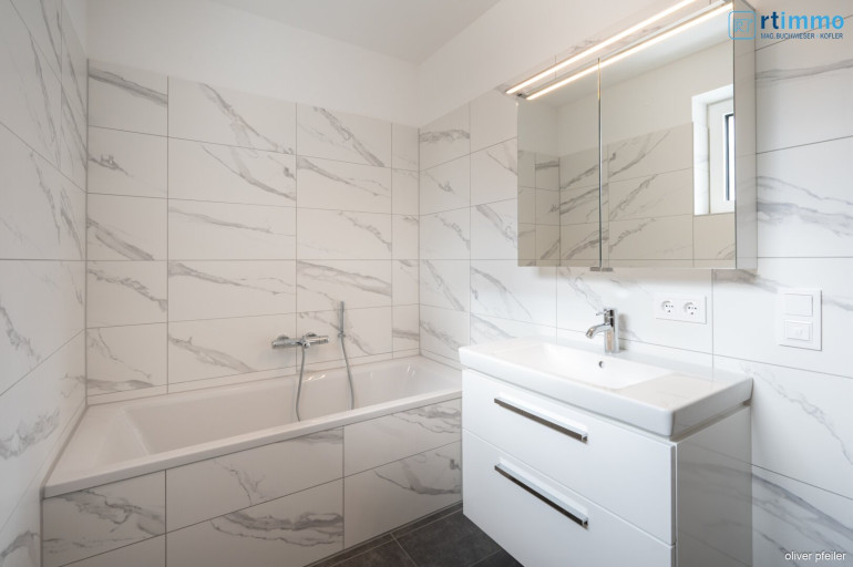 Fliesen, Parkett, Fußbodenheizung, Wohnküche / offene Küche, Bad mit Fenster, Badewanne, Parkplatz