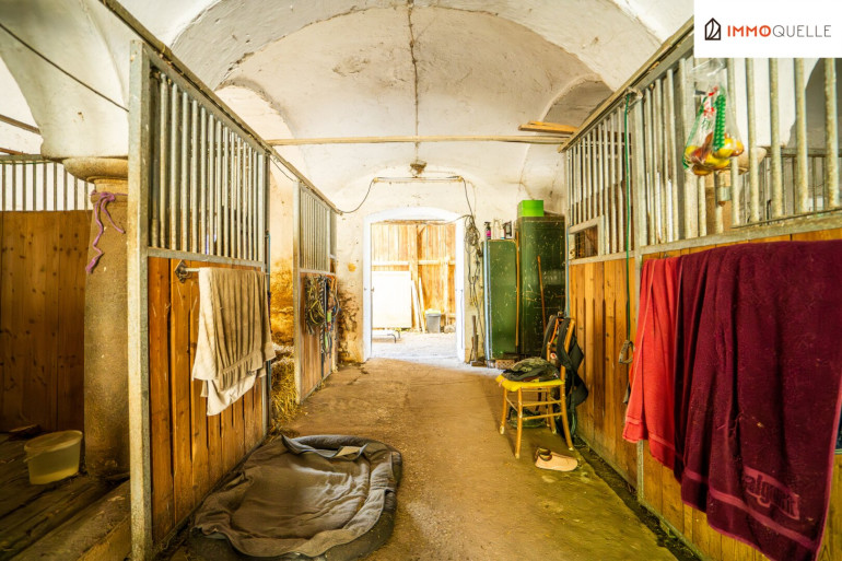 Der Stalltrakt mit Pferdeboxen, 160 m² Nutzfläche und darüberliegendem Heuboden bietet ideale Bedingungen für Tierhaltung. Weitere 80 m² Lager- und Garagenflächen im Nebengebäude eröffnen kreative Möglichkeiten – ob Hobbywerkstatt, Atelier oder Studio.