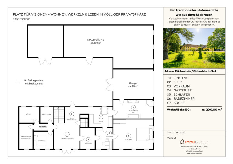 Versteckt inmitten sanfter Wiesen, begleitet vom leisen Plätschern der Url, liegt ein Ort, der mehr ist als ein Zuhause – er ist ein Versprechen. Ein Versprechen auf Freiheit, Ursprünglichkeit und Lebensqualität. Der historische Dreiseithof in Aschbach-Markt eröffnet auf über 12.600 m² Grundstücksfläche eine einmalige Gelegenheit für all jene, die Naturverbundenheit mit Platz für Ideen verbinden möchten.