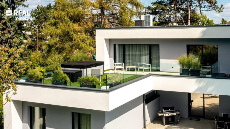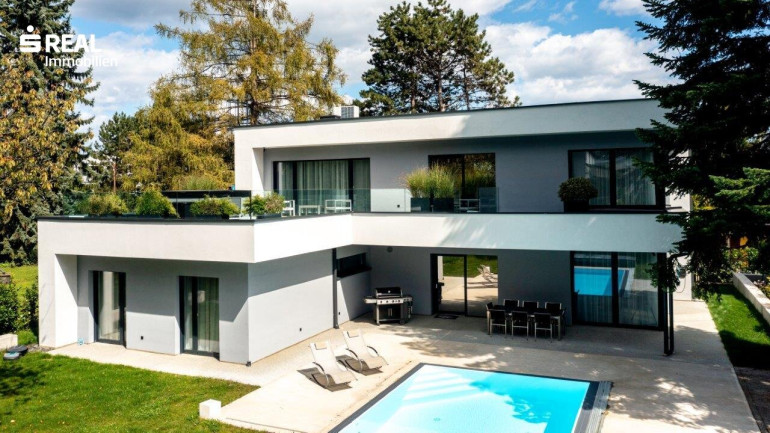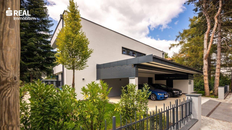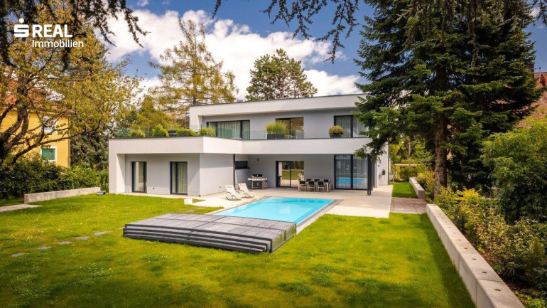 Zum Verkauf gelangt diese hochwertig ausgestattete und voll eingerichtete Villa mit 5 Zimmern in ruhiger Lage umgeben von Einfamilienhäusern im beliebten Bezirk Wetzelsdorf mit einer Nutzfläche von ca. 187,33 m². Das Gebäude vereint modernen Komfort sowie technische Ausstattung mit einem beheizbaren Infinity-Pool und eigenem ebenfalls voll ausgestatteten Pool/Gästehaus auf einem ebenen Grundstück von ca. 1.238 m². Beheizt werden die Gebäude mittels Luftwärmepumpe mit Fußbodenheizung. Eine komfortable Deckenkühlung sorgt zusätzlich im Sommer für angenehme Temperaturen. Die Gebäude wurden 2020 errichtet. Die Möglichkeit für zwei getrennte Wohneinheiten wurde ebenso bei der Planung berücksichtigt wie eine besondere Architektur und eine beeindruckende Raumhöhe im Wohnbereich von ca. 6 m mit elektrischem Vorhang vor der Fensterfront mit Blick auf das Grundstück.