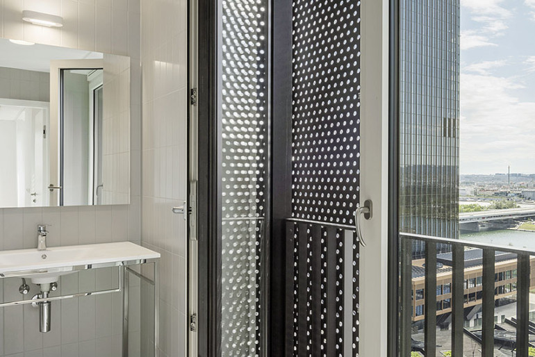 Das elegant gestaltete, 65 Meter hohe Wohnhochhaus von den Architekten Jabornegg & Pálffy besticht durch seine bodentiefen Fenster und Schiebeläden – die jeweils die Funktion des Blend- oder Sonnenschutzes übernehmen. Der individuelle Gebrauch der Lochblechläden fördert ein differenziertes Fassadenbild innerhalb einer sehr regelmäßigen Gliederung.Auf 17 Stockwerke verteilt finden sich 302 modernst ausgestattete 1- bis 3-Zimmer-Wohnungen