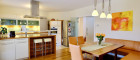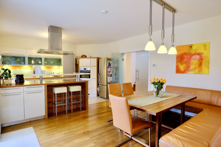 Die schicke DAN Küche in "Creme" ist sehr gelungen in das Raumkonzept integriert und bietet aufgrund der guten Küchenplanung mit netter Bar einen geselligen Platz, an dem man gerne auf ein Gläschen verweilt. Besonders schön ist hier der Blick in den Garten.
