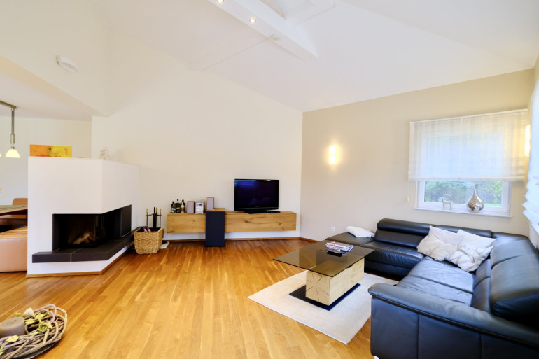Großzügig konzipiert empfängt das Entree und führt in den schön angelegten Wohn- Essraum. Das offene Wohnkonzept und eine Raumhöhe von ca. 4m im Wohnbereich verstärken die Großzügigkeit der Räume. Gediegene Holzböden, sowie ein perfekt platzierter Kaminofen mit modernem Sichtfenster vermitteln ein luxuriöses wie auch äußerst behagliches Wohngefühl.