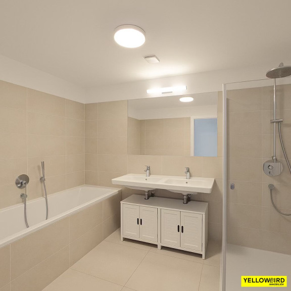 - BADEZIMMER: Badewanne, Dusche und Waschbecken