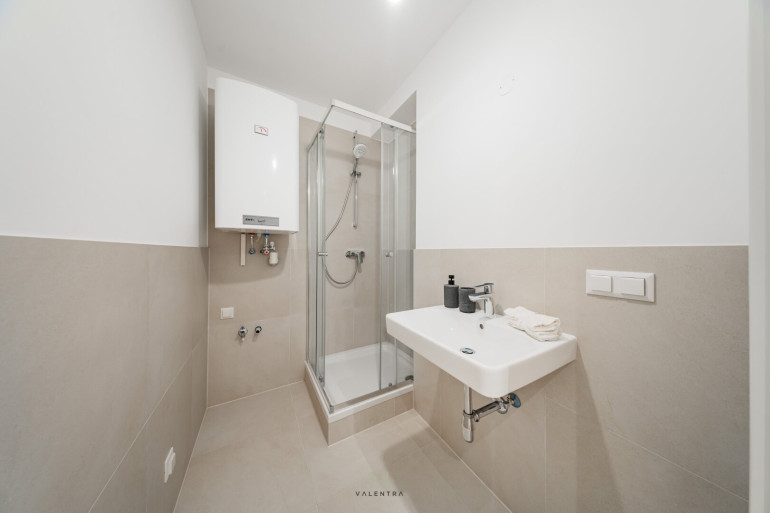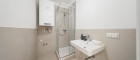 Das Badezimmer wurde mit modernen italienischen Fliesen (60×60 cm) gestaltet und mit einer hochwertigen Sanitärausstattung von Laufen und Grohe ausgestattet. Eine Dusche, ein Handtuchheizkörper sowie ein praktischer Waschmaschinenanschluss stehen zur Verfügung.
