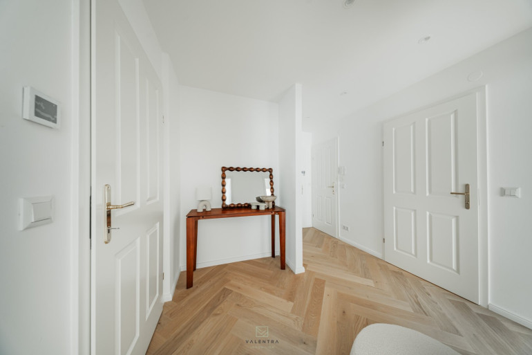 Der Wohnbereich ist nach Süd-West ausgerichtet und dadurch den ganzen Tag über angenehm hell. Der elegante Eichen-Fischgrätparkett verleiht dem Raum eine stilvolle Atmosphäre.
