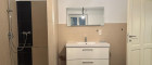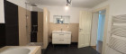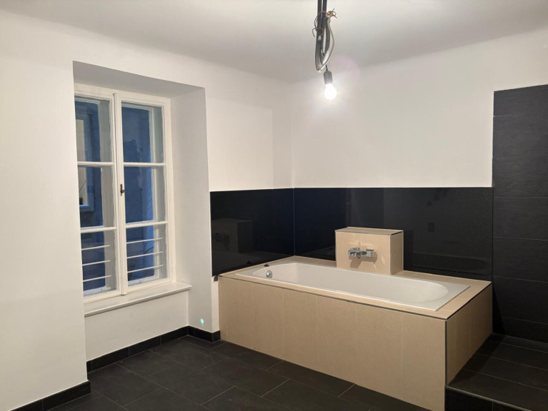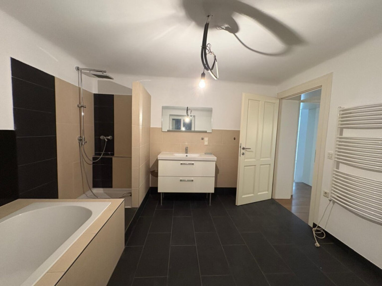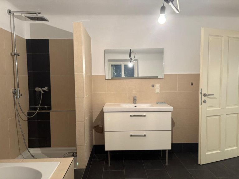 - Ein Badezimmer mit Dusche, Wanne, Waschbecken und WM-Anschluss