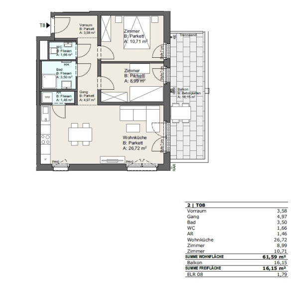 Das Projekt besticht durch eine ästhetisch anspruchsvolle, moderne Architektur, die sich harmonisch in die Umgebung einfügt. Hochwertige Materialien, Eichenparkett, großformatige Feinsteinfliesen, sowie Markenarmaturen in Bad und Küche garantieren ein exklusives Wohngefühl. Großzügige Fensterflächen schaffen helle, freundliche Räume und sorgen für ein angenehmes Wohnklima. Jede Einheit verfügt über mindestens eine Freifläche – ob Balkon, Terrasse, Loggia oder Garten – mit hochwertigen Betonplattenbelägen, punktueller Ambientebeleuchtung und frostsicherer Wasserentnahmestelle. Auch funktionale Aspekte wurden nicht vergessen: Fußbodenheizung, elektrische Handtuchheizkörper im Bad, dreifach verglaste Holz-Alu-Fenster mit elektrischem Sonnenschutz sowie vorbereitete Anschlüsse für TV, Internet, Telefon und Alarmanlagen (in EG-Wohnungen) sind Standard.