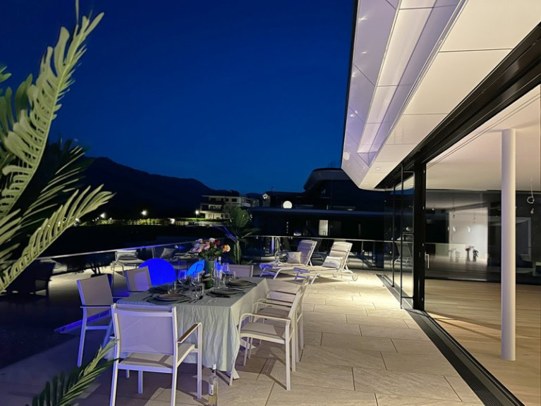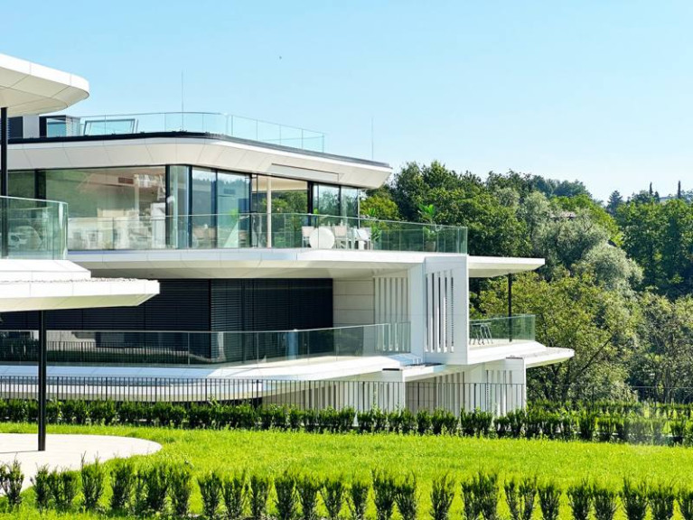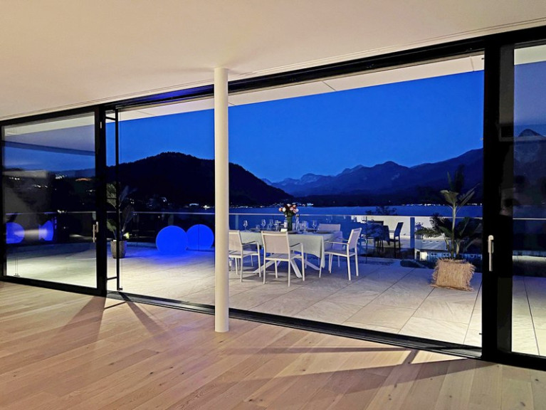 Nurglas-Portale und Glas-Fassaden, große Terrassen, voller Seeblick, Infinity-Pool, Badehaus mit Sundeck, Tiefgarage, modernste Heizung und Kühlung und natürlich der eigene BADESTRAND.