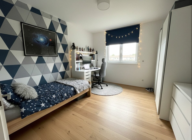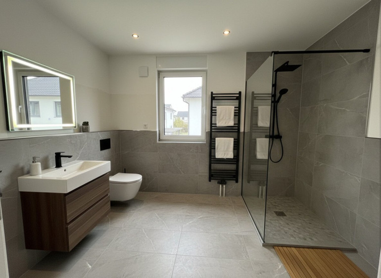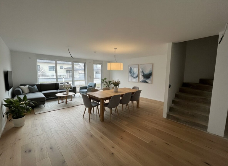 Zwei Etagen, durchdachte Grundrisse, luftige Räume, große Fensterflächen. Im Erdgeschoß: Wohnküche mit Zugang zum Garten, Technikraum, Gäste-WC. Oben: drei Schlafzimmer und ein großzügiges Bad. Kein Platz wird verschwendet – alles ist da, wo man’s braucht.