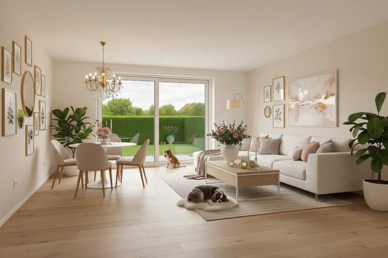 Genießen Sie entspannte Stunden auf Ihrer eigenen Terrasse oder gestalten Sie den Garten ganz nach Ihren Vorstellungen – ob grüne Ruheoase oder Spielbereich für Kinder. Zwei PKW-Stellplätze direkt vor dem Haus sind ebenfalls inkludiert.