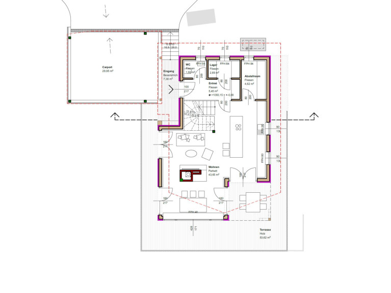 des Chalets. Das Erdgeschoss besteht aus einem Vorraum/Garderobe, einem Gäste-WC mit