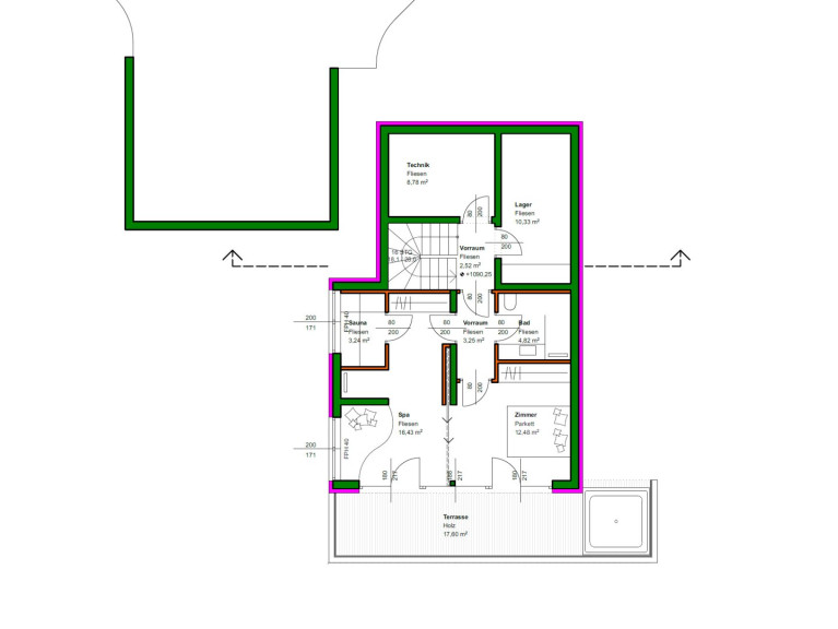 Die Untergeschossebene gliedert sich in einen Technikraum, einen großen Lagerraum, einen Wellnessbereich mit Sauna und Terrassenzugang, einem separaten Badezimmer und einem Gästezimmer mit Zugang zur Terrasse.