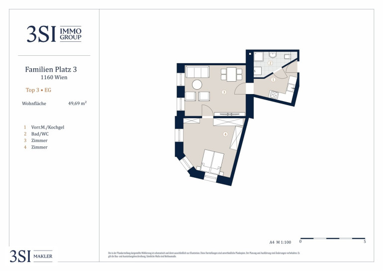 Diese teilmöblierte 2 Zimmer-Wohnung befindet sich im Erdgeschoß, verfügt über eine Wohnfläche von ca. 49,69m² und teilt sich wie folgt auf: