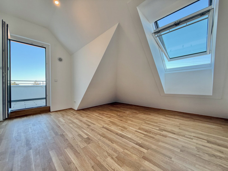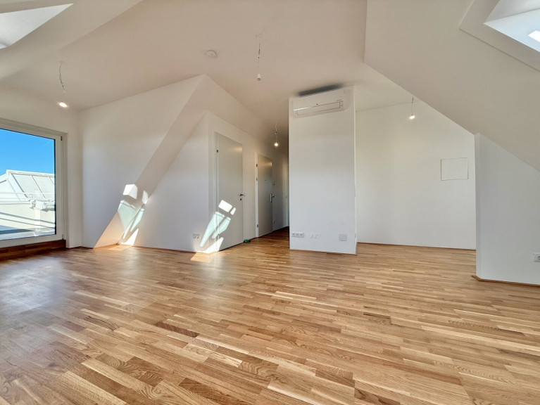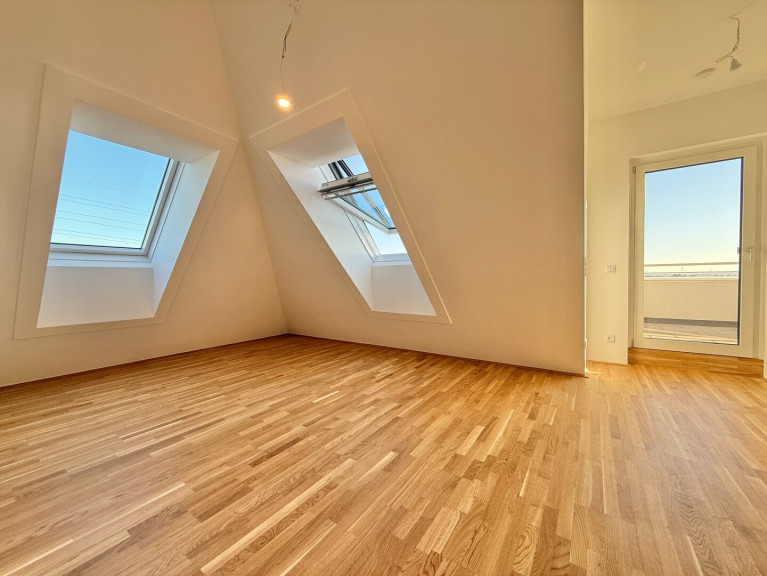 Die Dachgeschosswohnung erstreckt sich über ca. 101 m² und bietet ein weitläufiges Raumgefühl mit großzügiger Wohnküche und zwei weiteren Zimmern. Alle Räume sind zentral vom Vorraum aus begehbar. Drei Terrassen mit insgesamt ca. 27 m² sind unterschiedlichen Bereichen zugeordnet und separat begehbar.