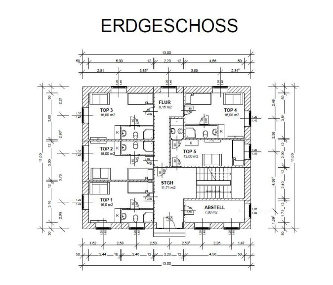 Das Zinshaus verfügt über 3 Geschosse und ist unterkellert. Im Erdgeschoss und 1. Obergeschoss befinden sich jeweils 4 Appartements, in Summe 8 Einheiten.