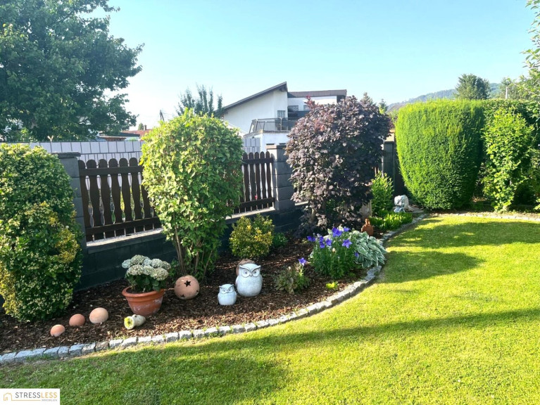 Auf der dem Haus vorgelagerten Terrasse können Sie nach einem anstrengenden Arbeitstag herrlich entspannen und den Blick in den wundervollen Garten mit Bioptop genießen.