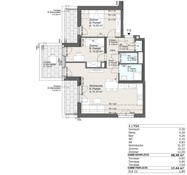 – Terrassen: ca. 4,95 m² + ca. 4,95 m² + ca. 7,54 m²