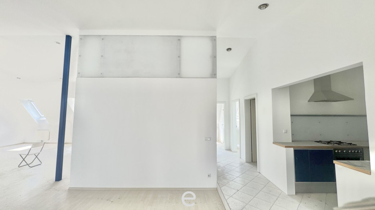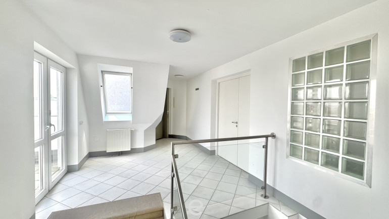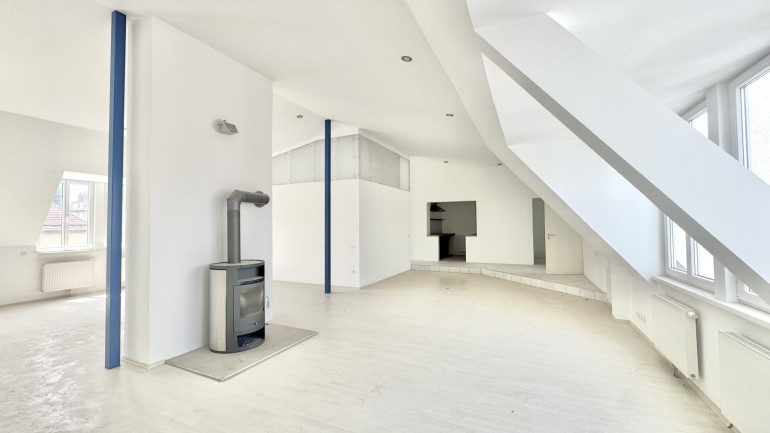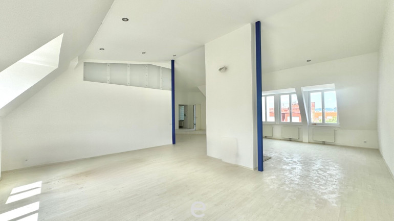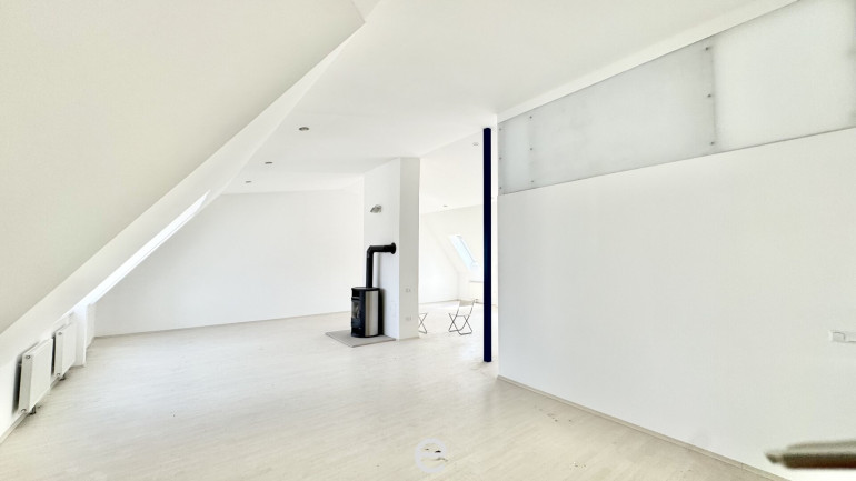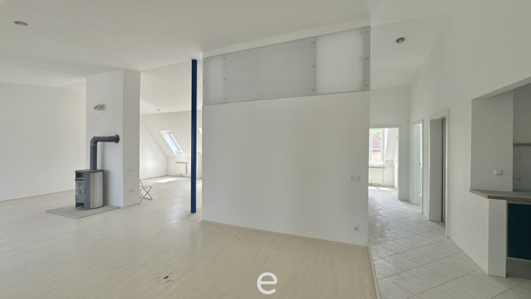 Die Wohnung besticht durch ihren durchdachten, offenen Grundriss, beeindruckende Raumhöhen von bis zu 4 Metern und eine angenehme, luftige Atmosphäre. Großzügige Dachflächenfenster auf beiden Seiten sorgen ganztägig für besonders viel Tageslicht und unterstreichen den hellen, weitläufigen Charakter der Räume. Herzstück ist der großzügige Wohn- und Essbereich mit Kamin, der fließend in die offene Küche übergeht. Darüber hinaus verfügt die Wohnung über ein Badezimmer mit Badewanne und Dusche, ein separates WC, einen Heizraum, integrierte Deckenspots sowie außenliegende Rollläden im Wohn- und Schlafzimmer. Der Lift fährt direkt ins Dachgeschoss und erschließt die Wohnung barrierefrei und exklusiv.
