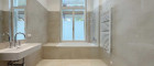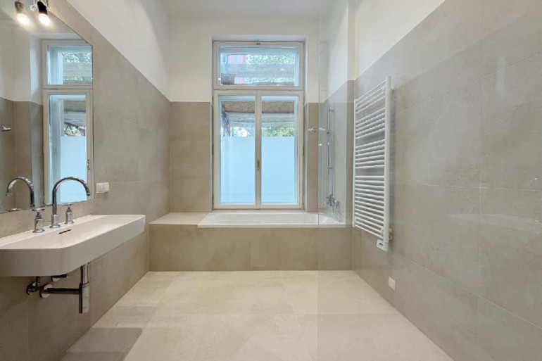Das Badezimmer ist ein echtes Highlight: Abgesehen von den großformatigen Fliesen, wird es durch ein großes Fenster belichtet,und ist mit einer Badewanne und einem Doppelwaschtisch ausgestattet. Besonders hervorzuheben ist die hochwertige Armatur im viktorianischen Stil: Verchromte Oberflächen, klassische Kreuzgriffe und feine Keramikelemente verleihen dem Raum einen Hauch von Luxus und zeitloser Eleganz – perfekt für ein anspruchsvolles Wohnambiente.