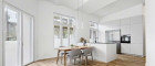 Ein eleganter Rundbogen und zwei kleine Treppenstufen führen in den lichtdurchfluteten Wohn- und Essbereich sowie das Badezimmer.