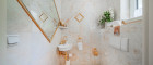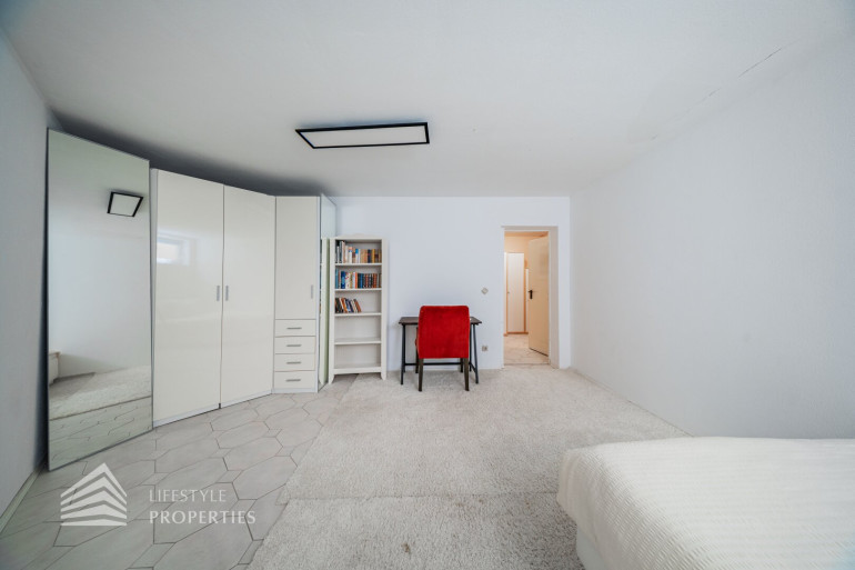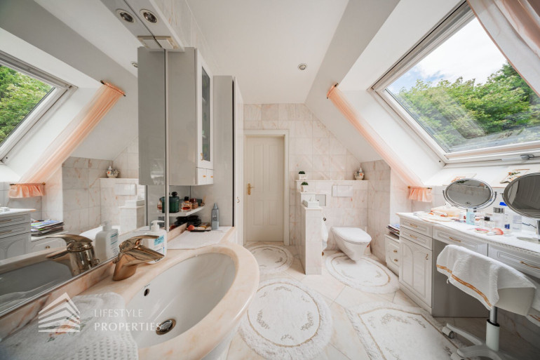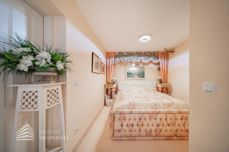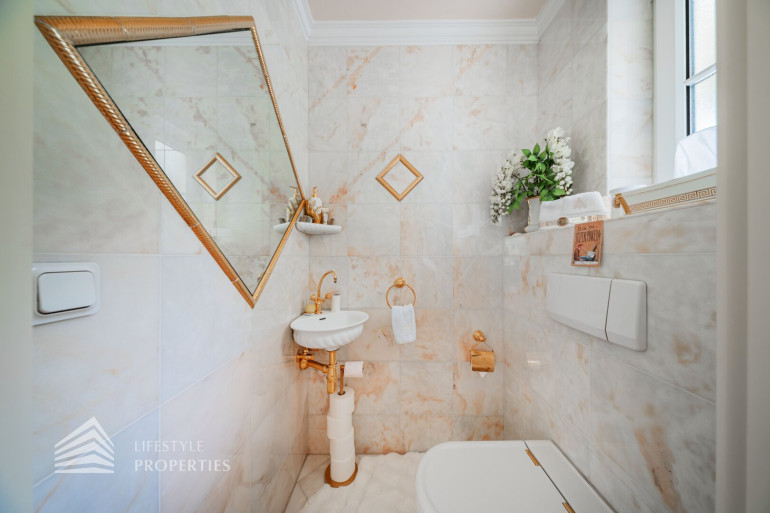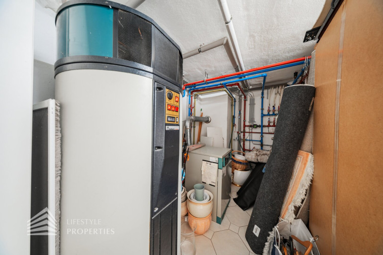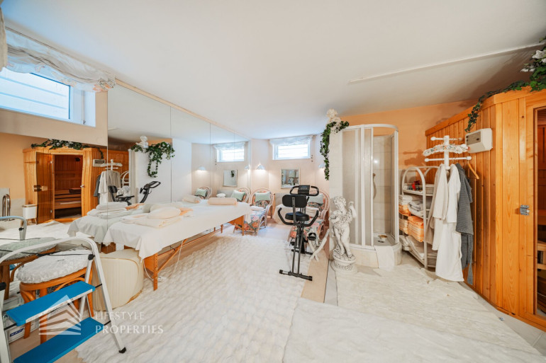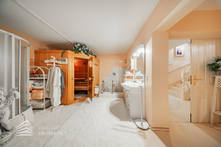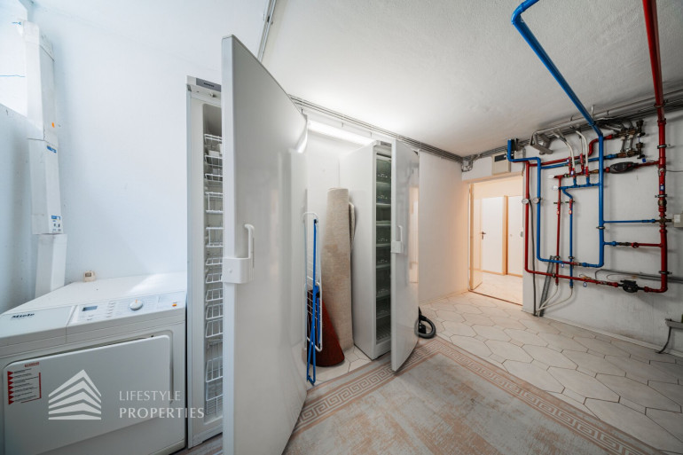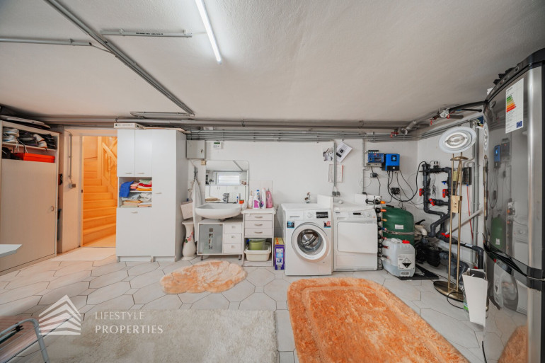 Des Weiteren verfügt die Villa über einen Wohnkeller, wo sich das Gästezimmer und der Wellnessbereich befindet. Ausgestattet mit einer finnischen Sauna und ein Kältebecken, einer Dusche, einen Waschbecken und einer separaten Toilette. Nebenan erreicht man den Wirtschaftsraum und Technikraum.