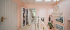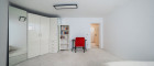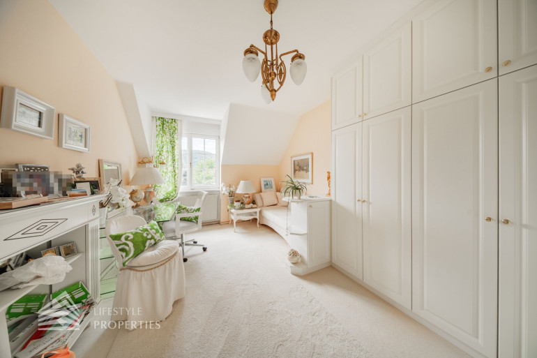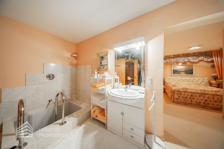 Links vom Esszimmer gelangt man in die vollausgestattete Küche, diese über viel Stauraum verfügt und mit einer schönen Essecke ausgestattet ist. Über eine Holztreppe gelangt man in den oberen Bereich des Hauses, wo sich die offene Galerie befindet. Von dort erreicht man das elegante Badezimmer, dieses mit einer Badewanne mit Massagedüsen, einen Waschtisch aus Marmor, einer Toilette und mit weißen Möbel vom Tischler ausgestattet ist. Rechts vom Badezimmer gelangt man in das klimatisierte Schlafzimmer, ausgestattet mit einen exklusiven Mobiliar und einen Balkon, wo man den herrlichen Garten beim Aufstehen betrachten kann. Neben dem Schlafzimmer befindet sich ein weiteres Zimmer, dieses sich als Arbeitszimmer oder Kinderzimmer eignet.