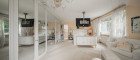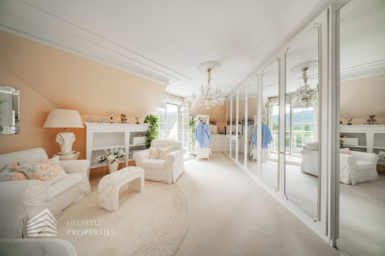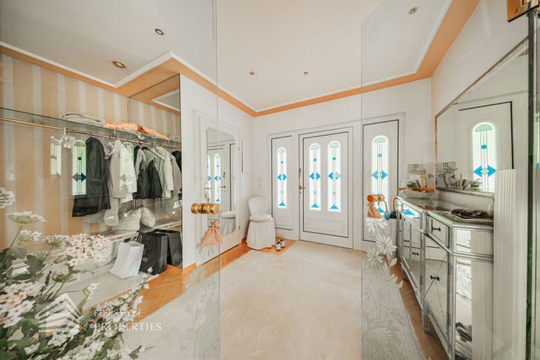 Beim Betreten der Villa befindet man sich direkt im Vorraum, diese mit einer großzügigen Garderobe und einen Windfang aus Glas ausgestattet ist. Rechts vom Eingang befindet sich die Toilette. Durch die Glastüre erreicht man den Essplatz und den exklusiven Wohnbereich mit seiner faszinierenden Ausstattung und den offenen Kamin, dieser durch zwei Stufen, mit edlen Säulen verbunden ist und durch die vielen Glasfronten und den Türen zur Terrasse mit viel Tageslicht durchflutet ist.
