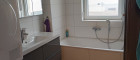 - modernes Badezimmer mit Badewanne und großem Fenster