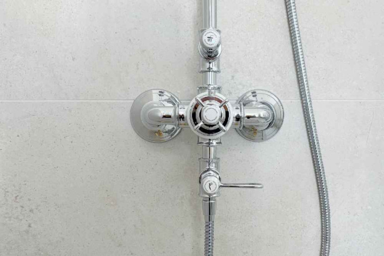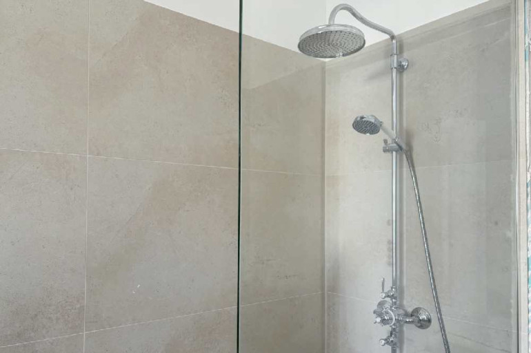 - ein elegantes Badezimmer mit bodenebener Dusche, Waschbecken und stilvollen Armaturen im viktorianischen Stil